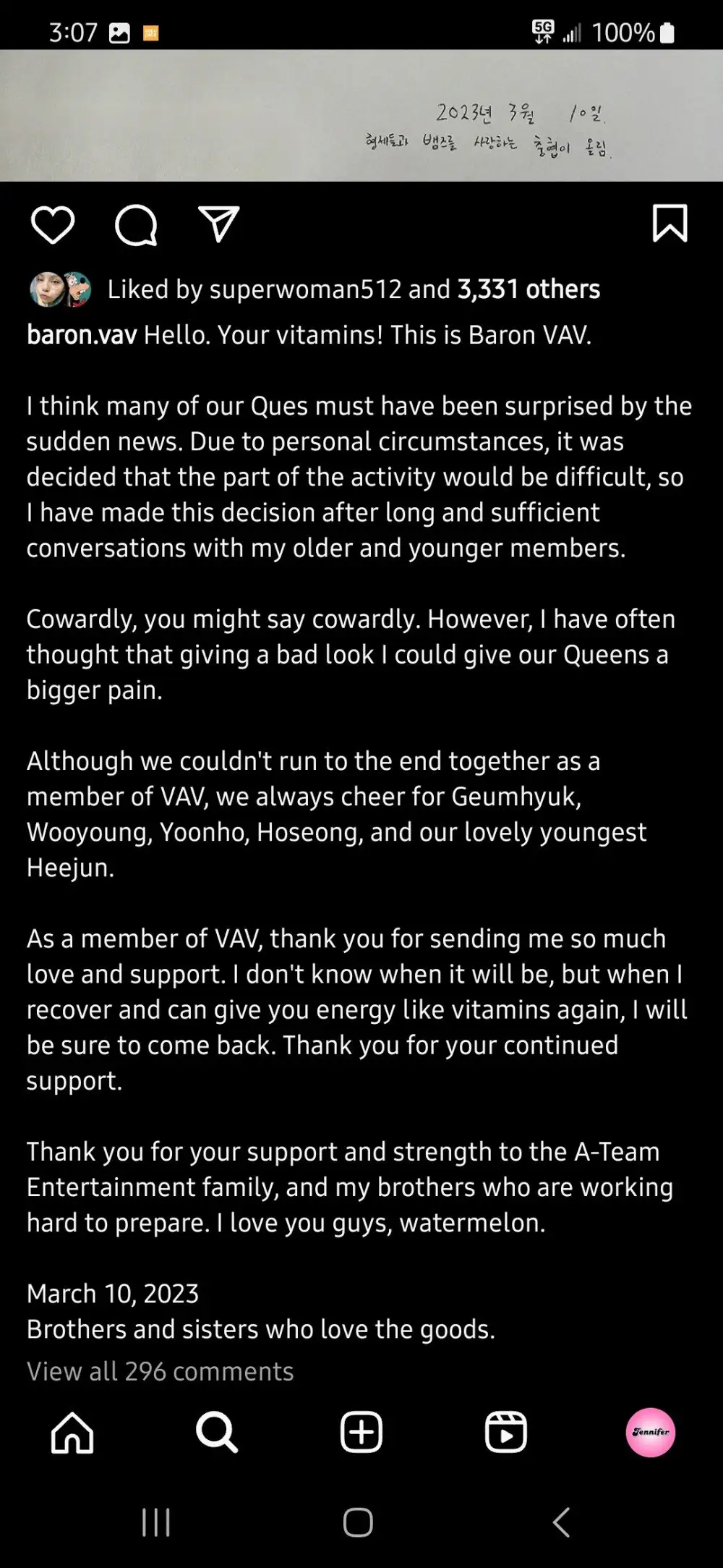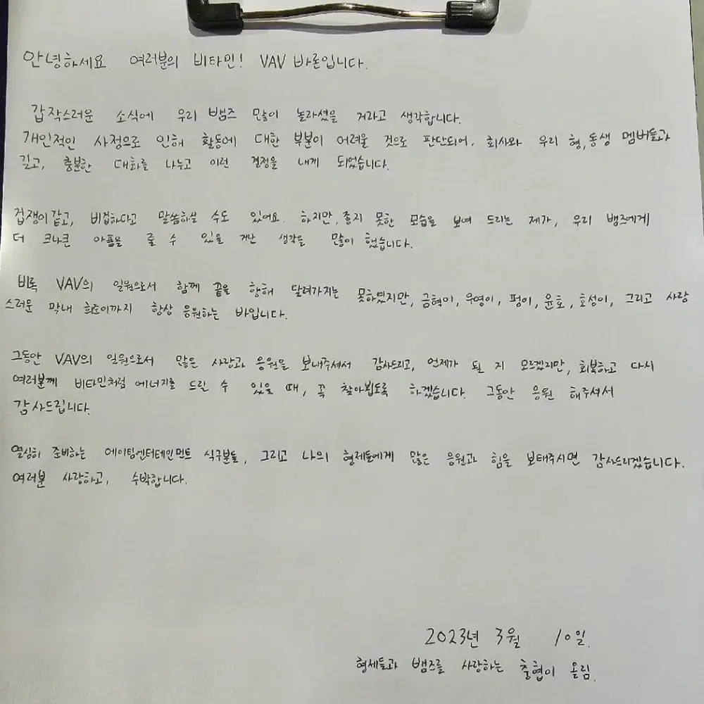 Kami memberitahu anda bahawa ahli VAV Baron (nama sebenarnya: Choi Choong-hyeop) telah memutuskan untuk meninggalkan pasukan dan menamatkan kontrak eksklusif pada 10 Mac 2023, atas sebab keadaan peribadi.